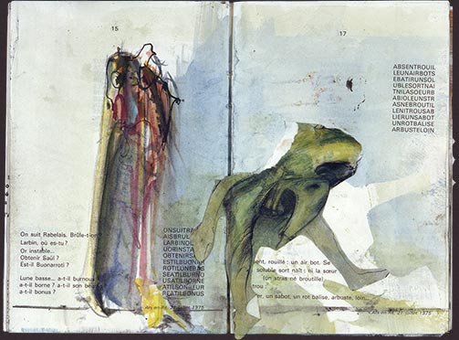 1976Dado fait don au Centre Pompidou du Diptyque d’Hérouval peint entre 1975 et 1976. En collaboration avec Alain Controu, il grave entre 1976 et 1978 quinze planches pour illustrer le Livre de Job. Ne trouvant pas d’éditeur, Dado confie avoir voulu « faire exploser le Livre de Job » en reprenant tout le tirage à la gouache et en le découpant en 1979 pour en faire une série de collages, technique qu’il affectionne déjà particulièrement depuis environ deux ans, encouragé par Jean-François Jaeger (Le Boucher de saint Nicolas, 1974, Mayfair House, 1974). Parution de la première édition d’Alphabets, recueil de 176 poèmes en onze vers de Georges Perec, aux Éditions Galilée (Michel Delorme), qu’il illustre de 21 dessins à l’encre de Chine et d’une gravure en noir. Dado reprendra ces dessins en couleur pour une édition ultérieure, parue en 1985.