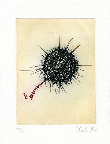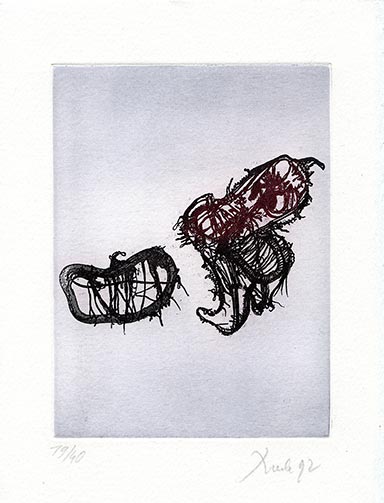 Suite de cinq gravures pour Dadomorphes et dadopathes de Claude Louis-Combet, 1992, eau forte et aquatinte, 19 × 14,5 cm. Alain Controu, imprimeur.