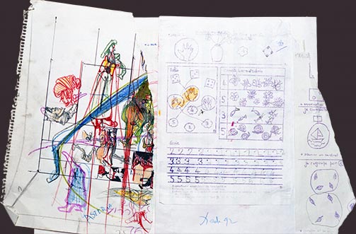 En collaboration avec Prescillia, 1992, technique mixte et collages sur papier. État antérieur. Photo : Domingo Djuric.