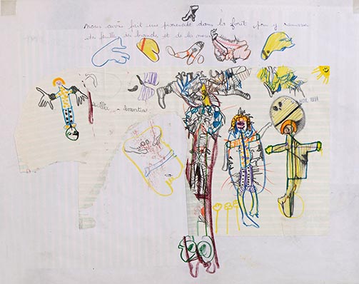 En collaboration avec Prescillia, 1992, technique mixte et collages sur papier, 36 × 45,5 cm (recto). Ancienne collection Tamara et Jean-Louis Martinoty.